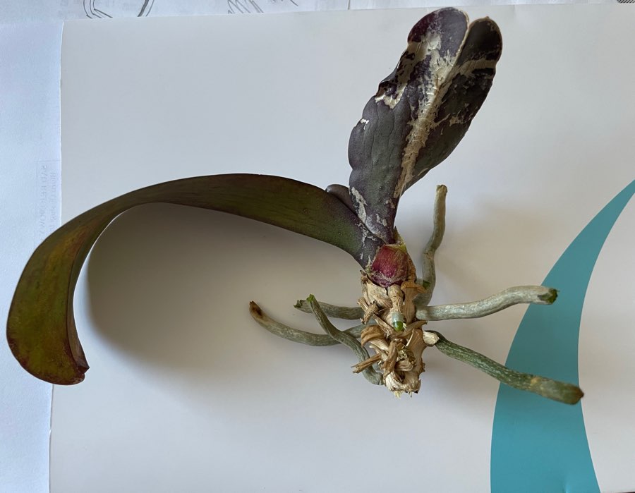 Wypuszcza korzenie i chyba nowy liść, więc nie jest jeszcze tragicznie. Wsadź w małą doniczkę, w podłoże do storczyków, umieść najlepiej w dużym szklanym naczyniu albo plastikowym przezroczystym pojemniku, żeby była duża wilgotność i podstaw w jasne miejsce.