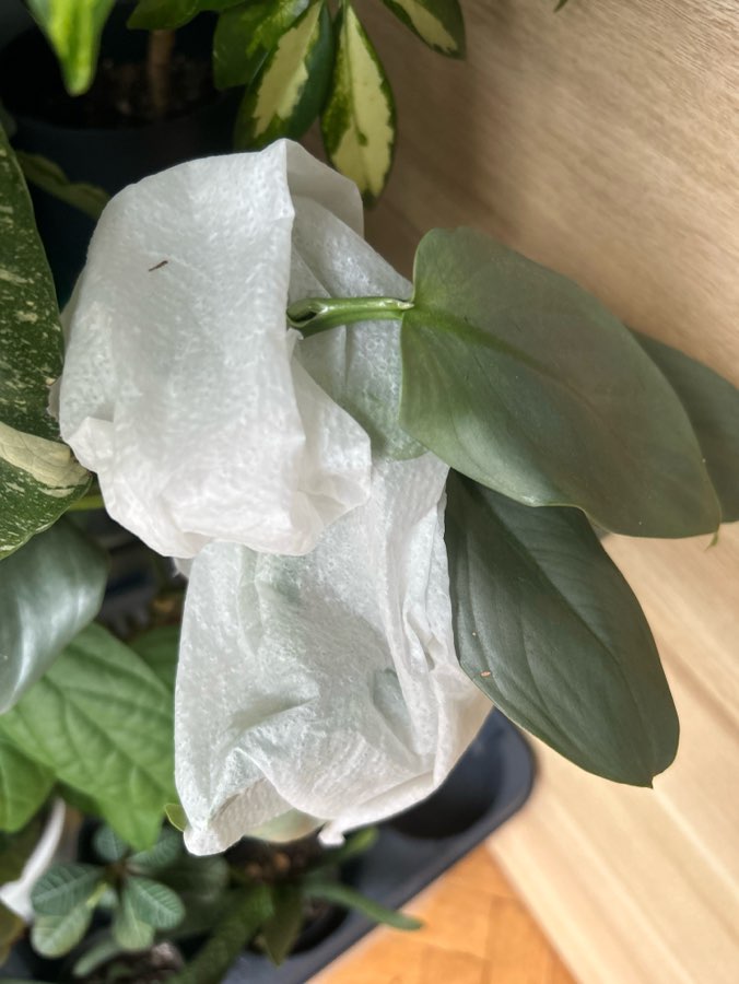 Utknęły w łusce nowego liścia (katafyllu) i nie mogą się rozwinąć. Często tak się dzieje u filodendronów i podobno powodem jest niska wilgotność. Ja wcześniej próbowałam delikatnie otworzyć osłonę wykałaczką, ale łatwo uszkodzić młody liść. Jak wyczytałam uwięźnięty liść trzeba owinąć mokrym ręcznikiem papierowym, co też uczyniłam - zobaczymy za kilka godzin.