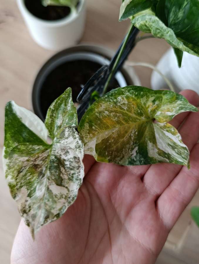 Jakieś 2 miesiace temu walczyłam z wciornastkami i profilaktycznie spryskalam ją Karate Spray owadobójczym. Jeszcze trochę wcześniej na niektórych liściach pojawiły się takie ciemne plamki, ale nie na wszystkich, wtedy tez liscie nie wypadały wiec się nie przejęłam. Nowe pędy u góry przez jakiś czas wyrastały niedobarwione, ale teraz widzę że najświeższe części wyglądają normalnie i zdrowo.