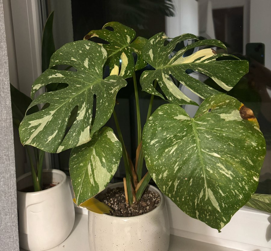 Zauważyłam, że moja monstera ma suche plamy. Od czego one mogły powstać? Nie mamy prawie światła w mieszkaniu, więc stoi na oknie od wschodniej strony. Co zrobić z moją tajką żeby przetrwała zimę? Planuje zakup żarówek i chciałabym zacząć ją doświetlać. Pytanie czy to wystarczy i mogę ją wtedy postawić z dala od okna. Dodam, że zakupiłam ją przelaną z jedną plamą, a latem przetrwała inwazję wciornastek 🥹